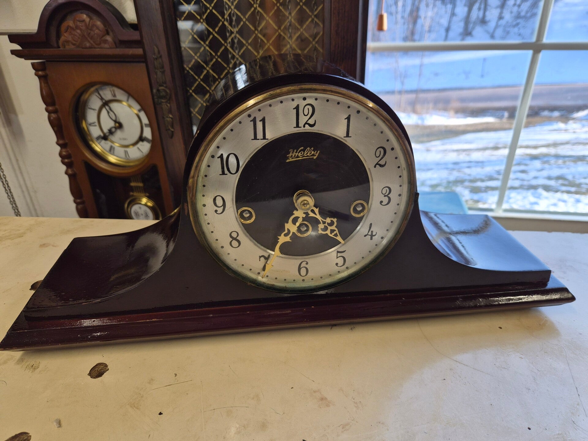 The Welby Clock Westminster Chime is a vintage mechanical wall clock with a unique Westminster chime sequence. Made of wood, brass, and glass, this 8" x 19" x 5" clock features a tambor shape and a dark oak finish. The clock comes with a key for winding the spring power source and has an art deco style perfect for any room. Imported from Germany in the late 20th century, this original mantle/desk clock is a decorative and functional collectible for clock enthusiasts.Clock is in nice shape for its age. Beautiful westminster chimes sound. Clock is working as it should. There is no returns and we do not accept responsibility for shipping damage.